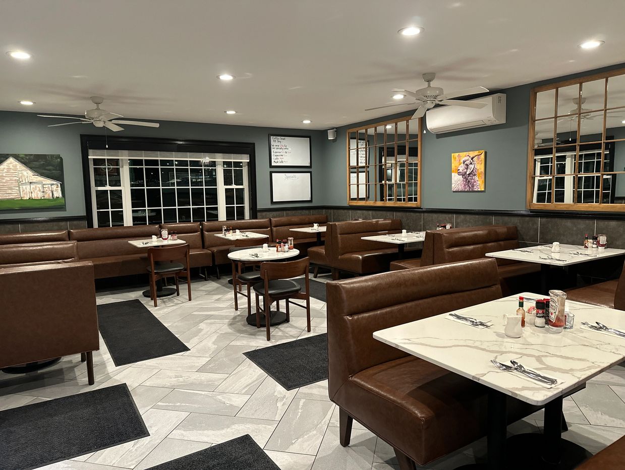 Step inside, and you will find a dining room that blends modern comfort with authentic local character. The space is bright and clean, featuring comfortable leather seating and large windows that fill the room with natural light. While our interior is polished and contemporary, the walls are adorned with vibrant paintings celebrating Vermont’s iconic barns and landscapes—a colorful nod to the beautiful region we call home.
